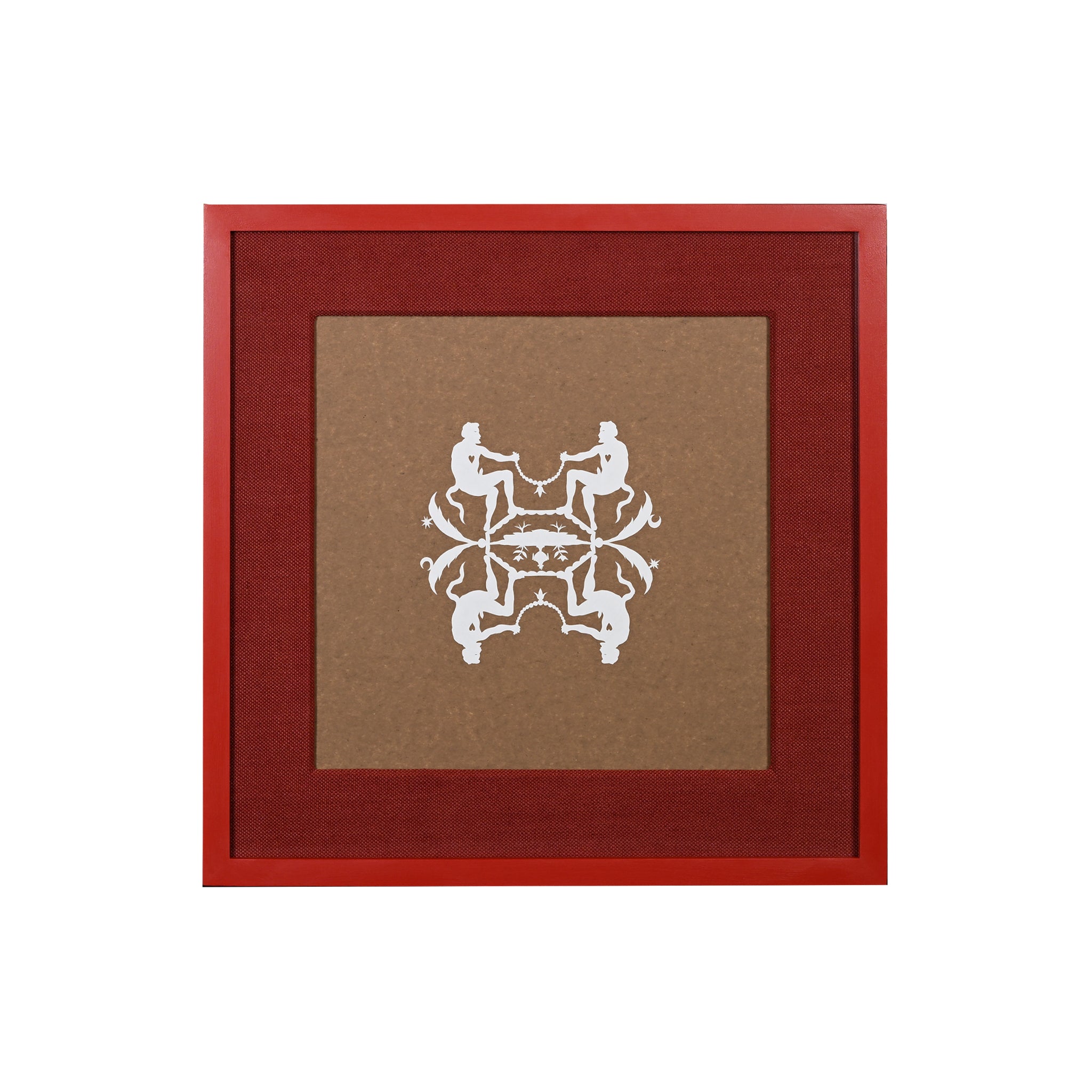 Framed on brown paper with red linen wrapped mat and custom painted red wooden frame and UV plexi.