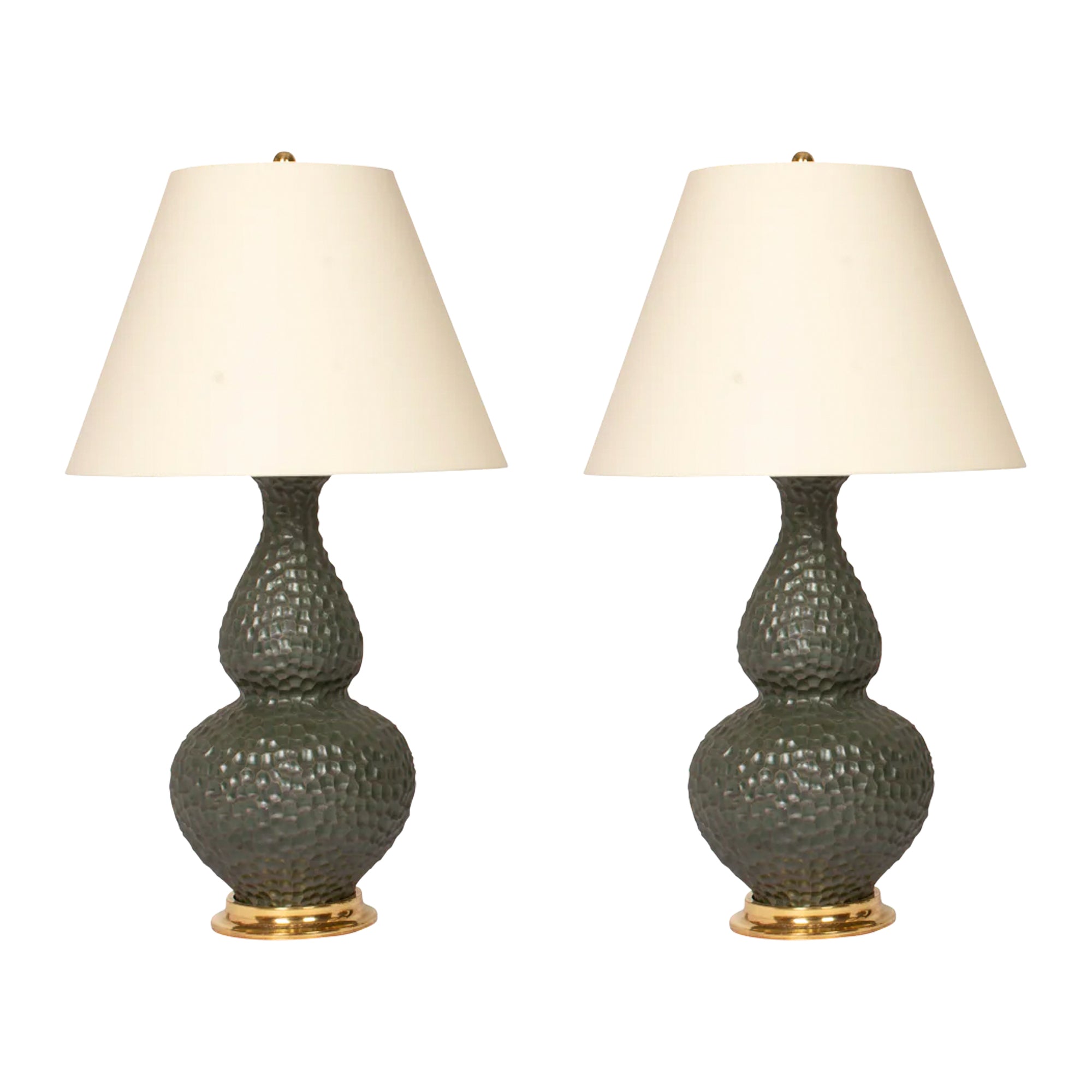 Pair of Large Aurora Lamps with Chipping in Matte Green Patina