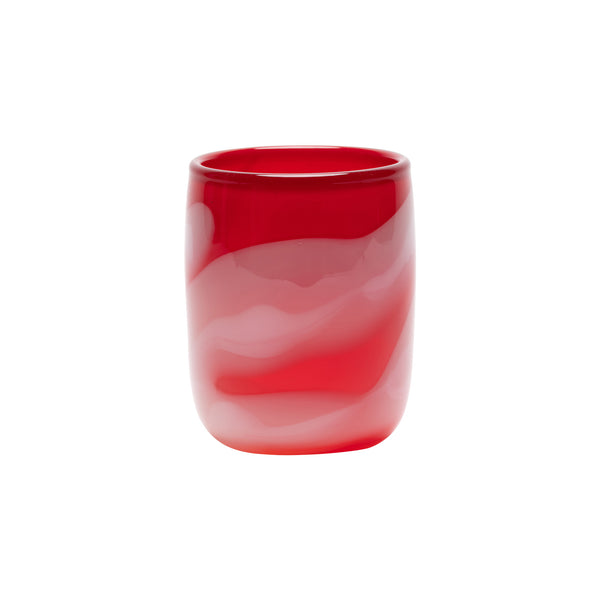 This one-of-a-kind red vase is accented with flamingo pink and white strokes. Each glass vessel is carefully hand-blown and shaped. This piece stands artfully on its own or can be dressed with flowers.
