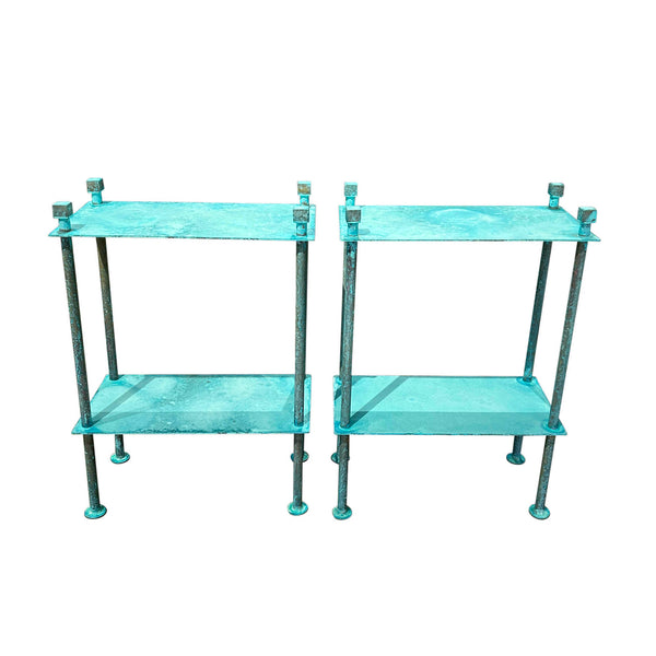 Once learning the nuances of brass and bronze, Corbin Cruise began to take form. The idea of manipulating the finish of these materials was the driving force behind much of his design. The faux hammered “gouge” finish and the aqua/turquoise “marine” grants his work with versatility, thus allowing them to exist in various spaces.