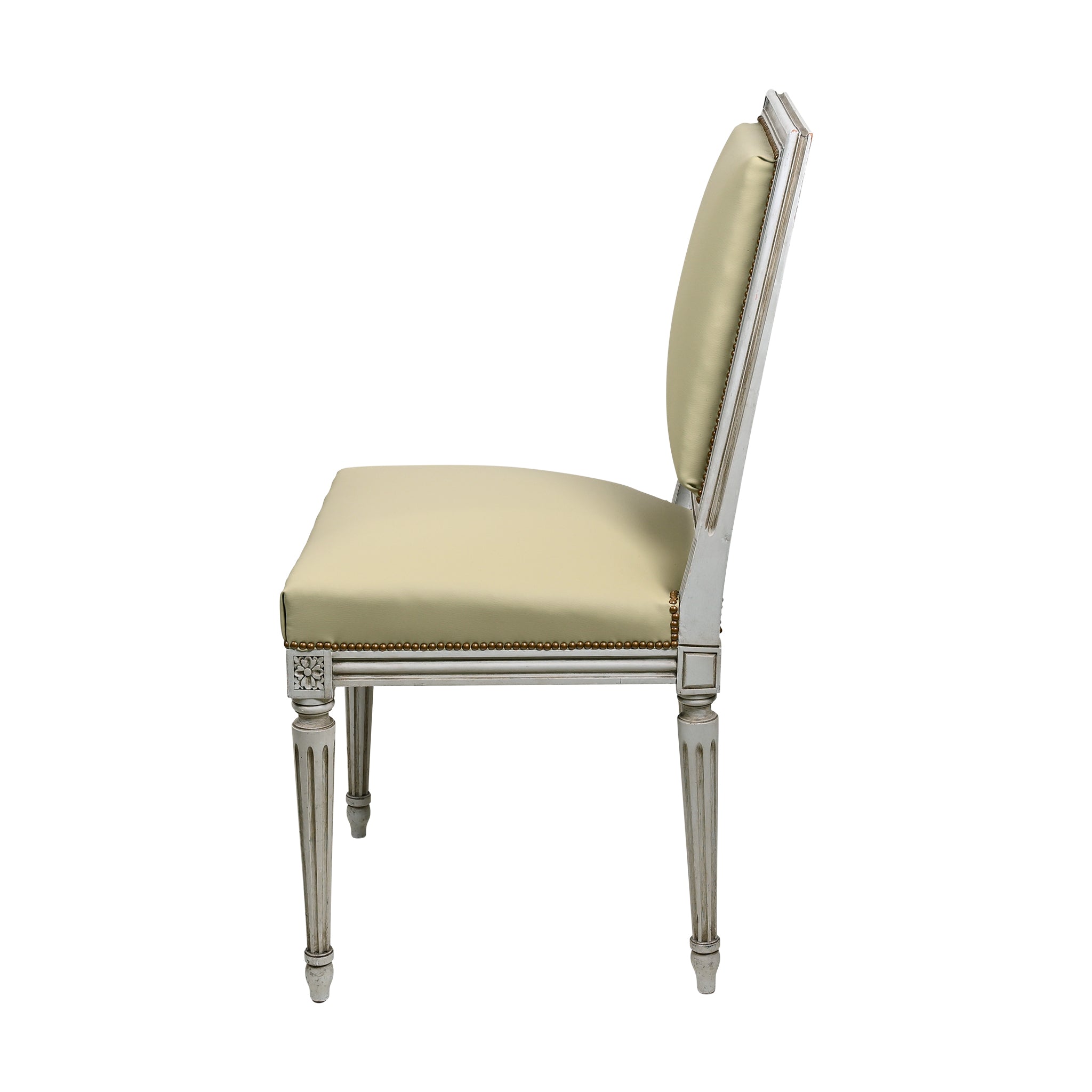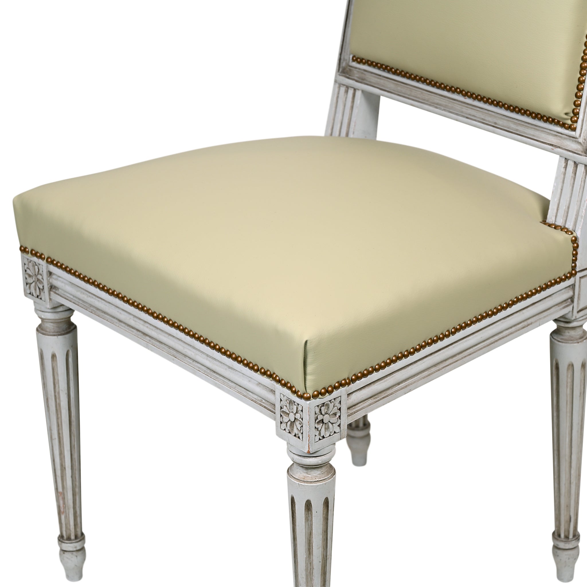 Newly reupholstered in pistachio faux leather with brass nailhead trim.