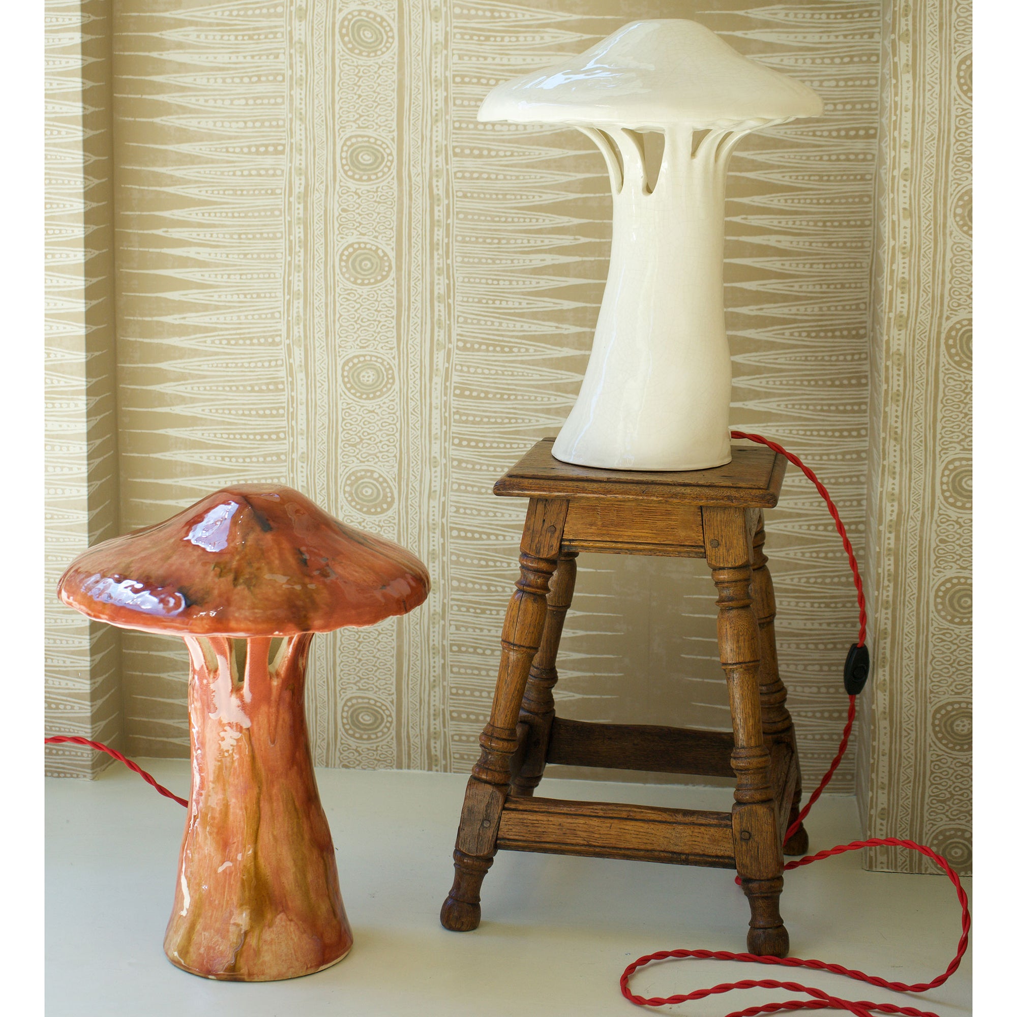 Featuring Atelier MVM's signature red silk twist cord with line switch. Lamp takes a single bulb, which illuminates from the base.