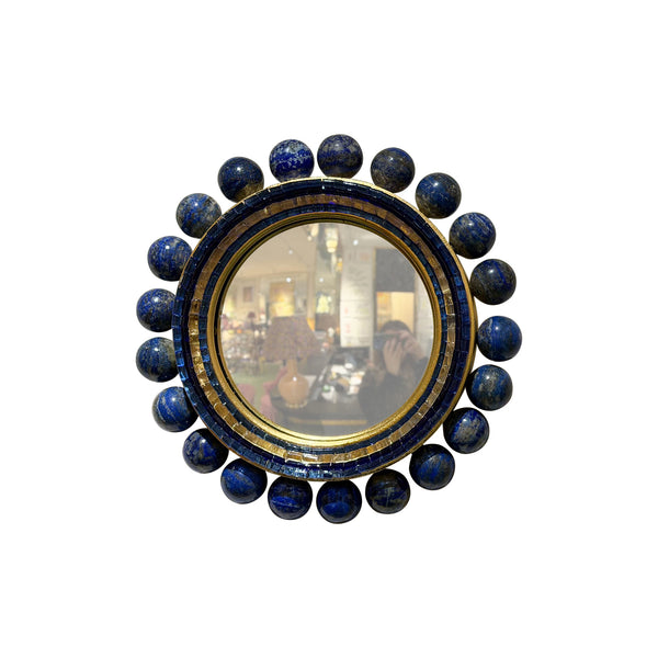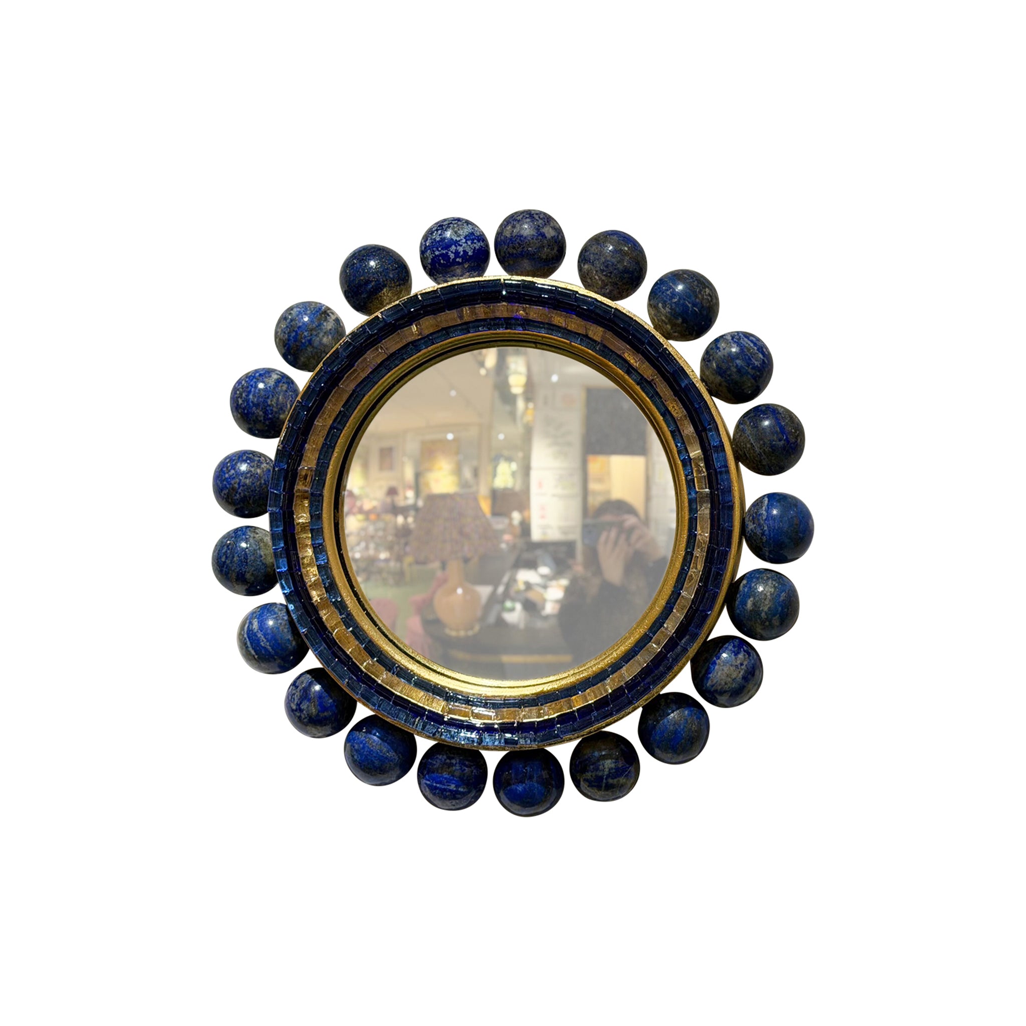 Lapis lazuli spheres surround Venetian glass on a gold metal leafed frame. Convex mirror.