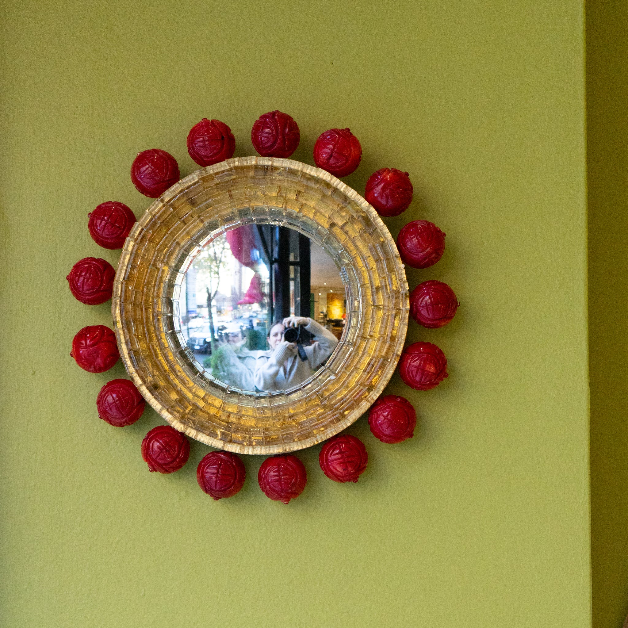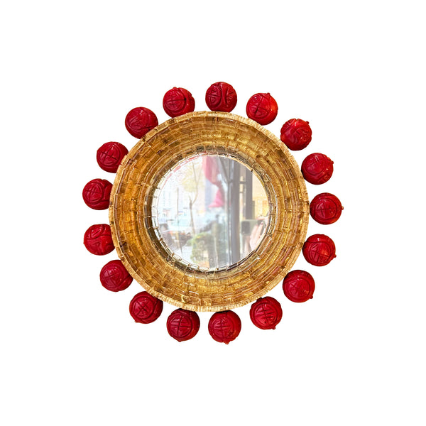 Coral-colored wooden beads with Chinese design motifs surround pale gold colored Venetian glass rods. The innermost ring of glass features hot orange detailing. A gold metal leaf frame surrounds the convex mirror.
