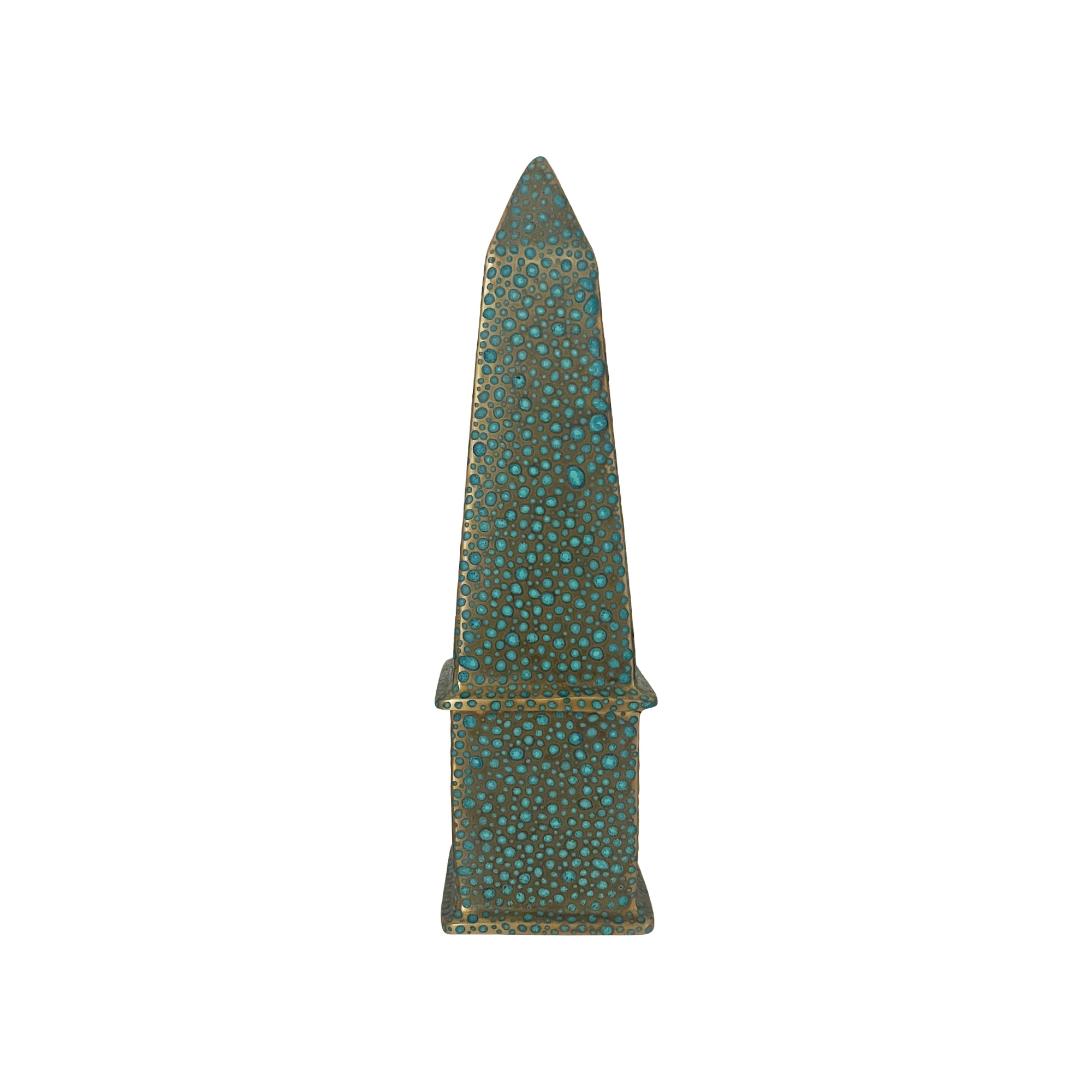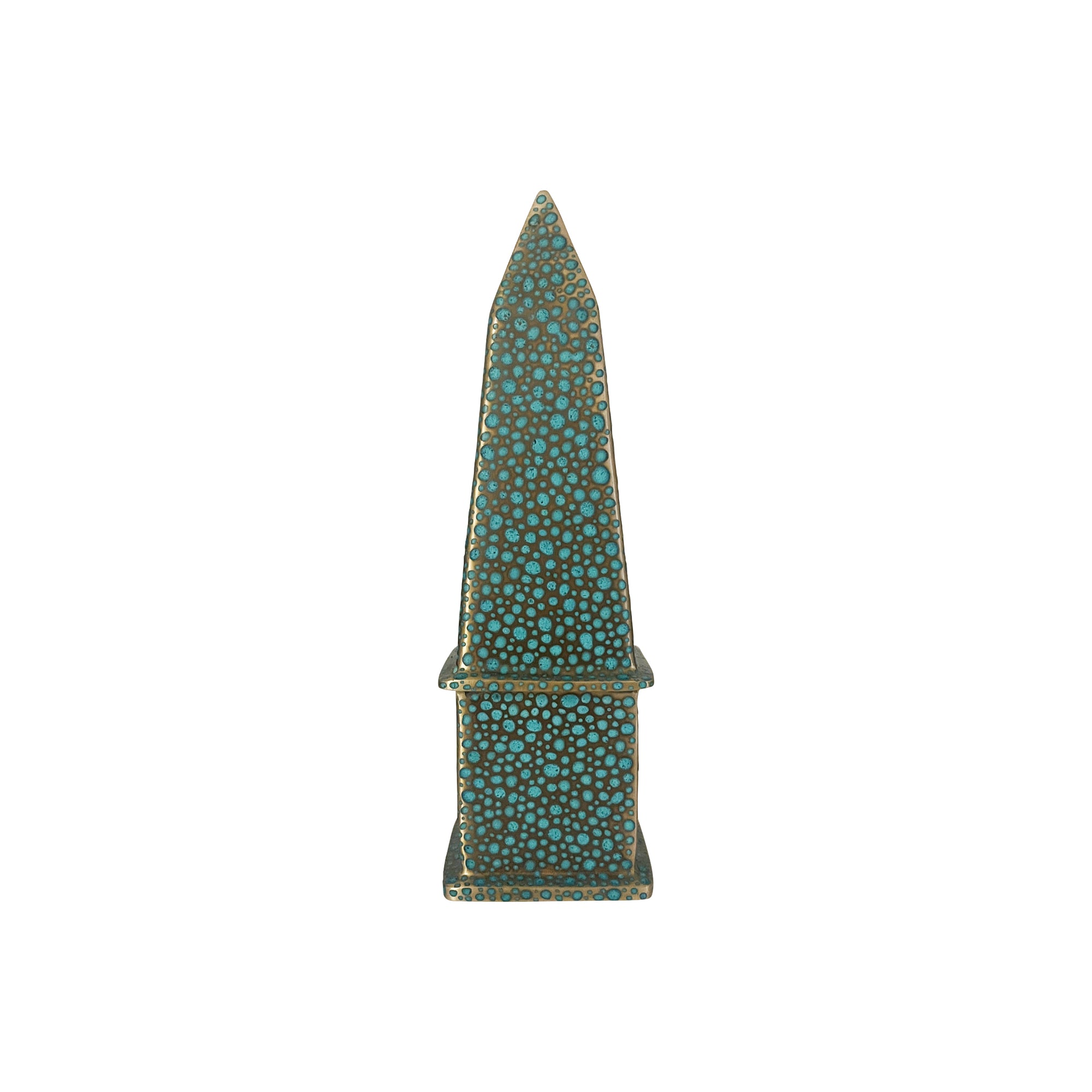 This solid brass obelisk is handmade and hand-painted with patina and sealed with a matte lacquer finish. Both the brass and patina are “living” materials and therefore have the possibility of changing over time, depending on the atmosphere or conditions of its environment. These possible changes are welcomed and considered by the artists.