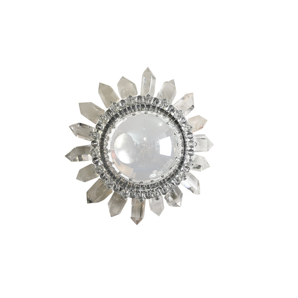 A corona of crystal beads on a silver metal gilded frame. Clear Venetian glass rods emphasize the shape of the frame. The frame is starred with larger rock crystal points and surrounds a true half dome mirror.