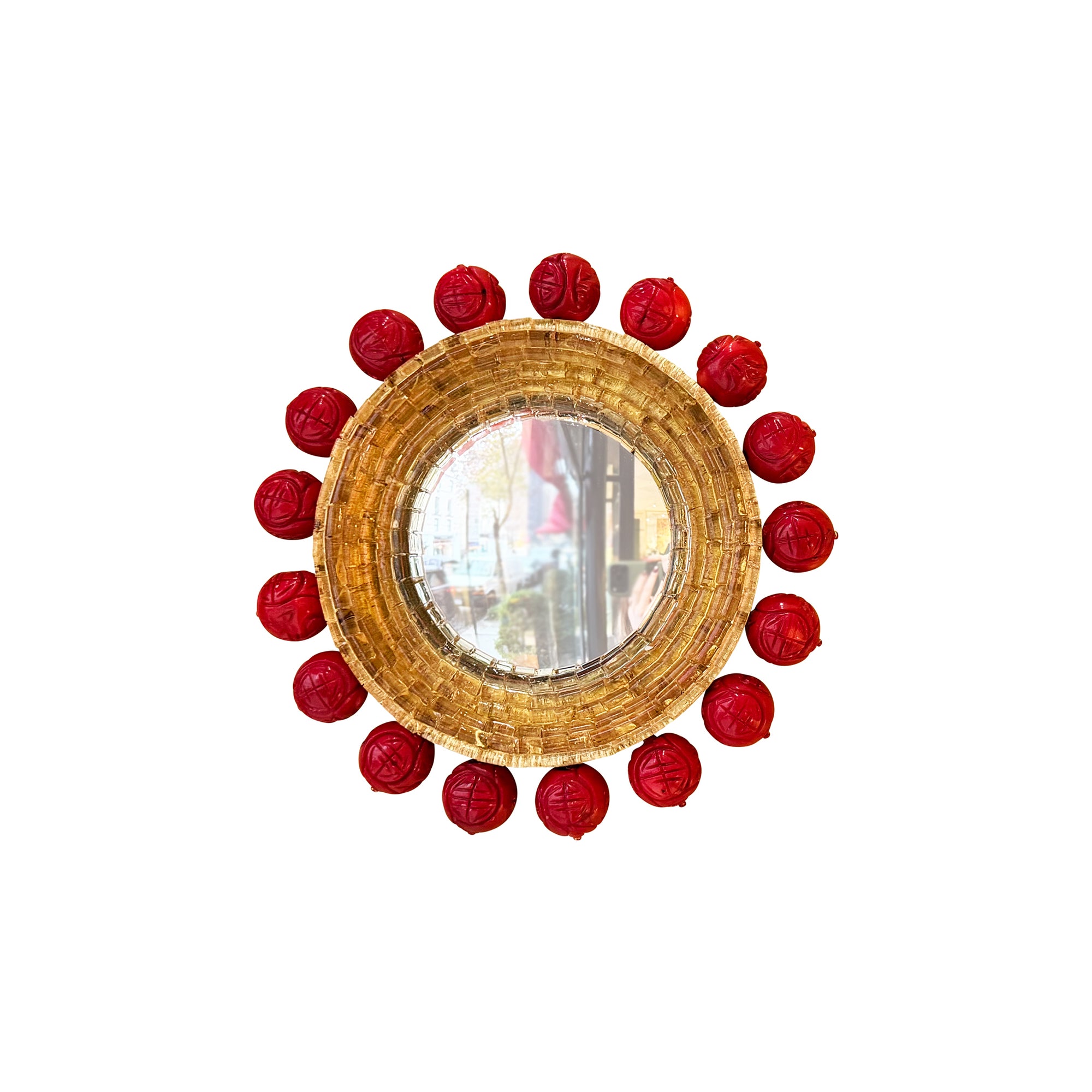 Coral-colored wooden beads with Chinese design motifs surround pale gold colored Venetian glass rods. The innermost ring of glass features hot orange detailing. A gold metal leaf frame surrounds the convex mirror.