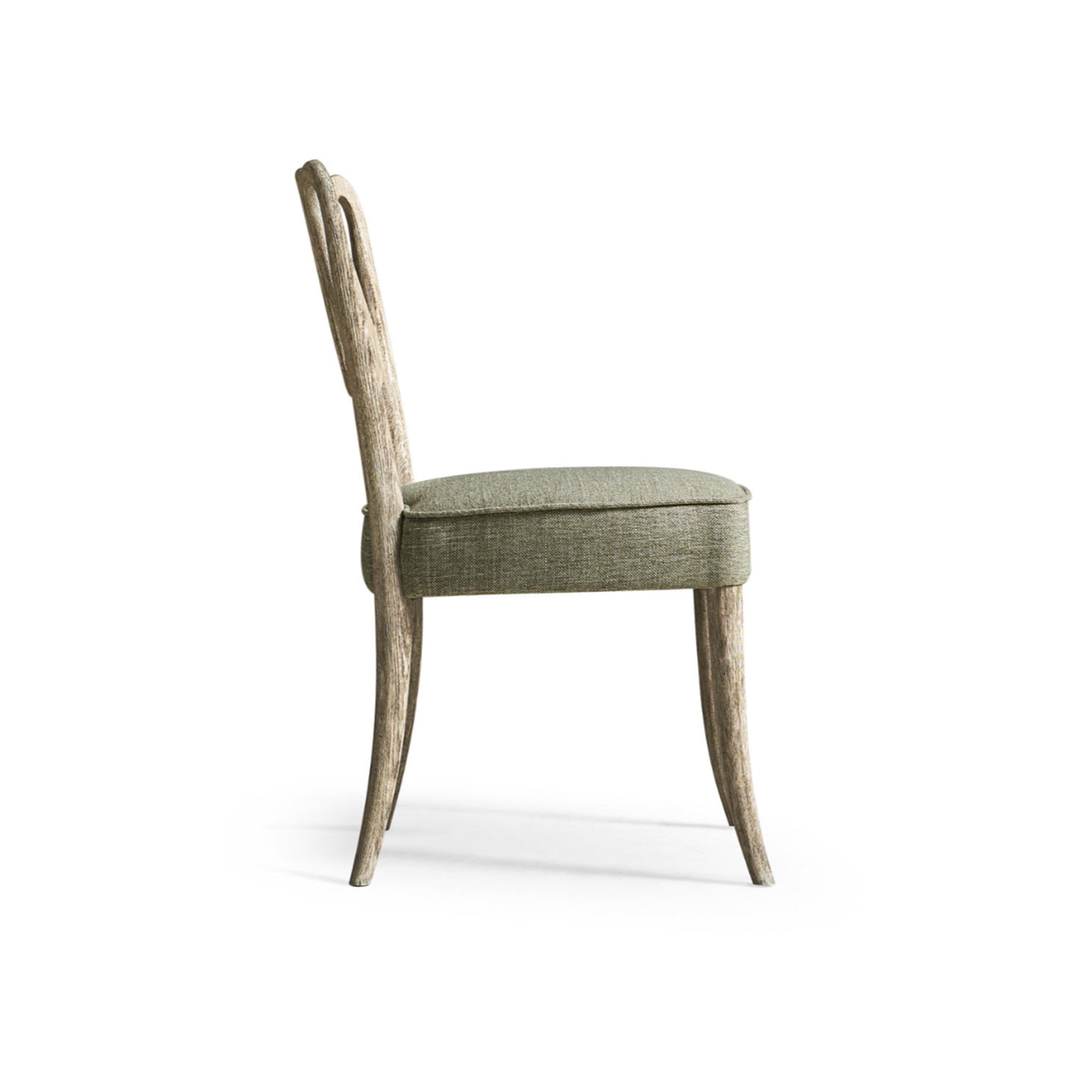 The chair is crafted from solid oak in a washed grey finish. Upholstered in a handsome sage performance fabric, the piece can easily fit in a high-traffic dining area or used as desk chair.