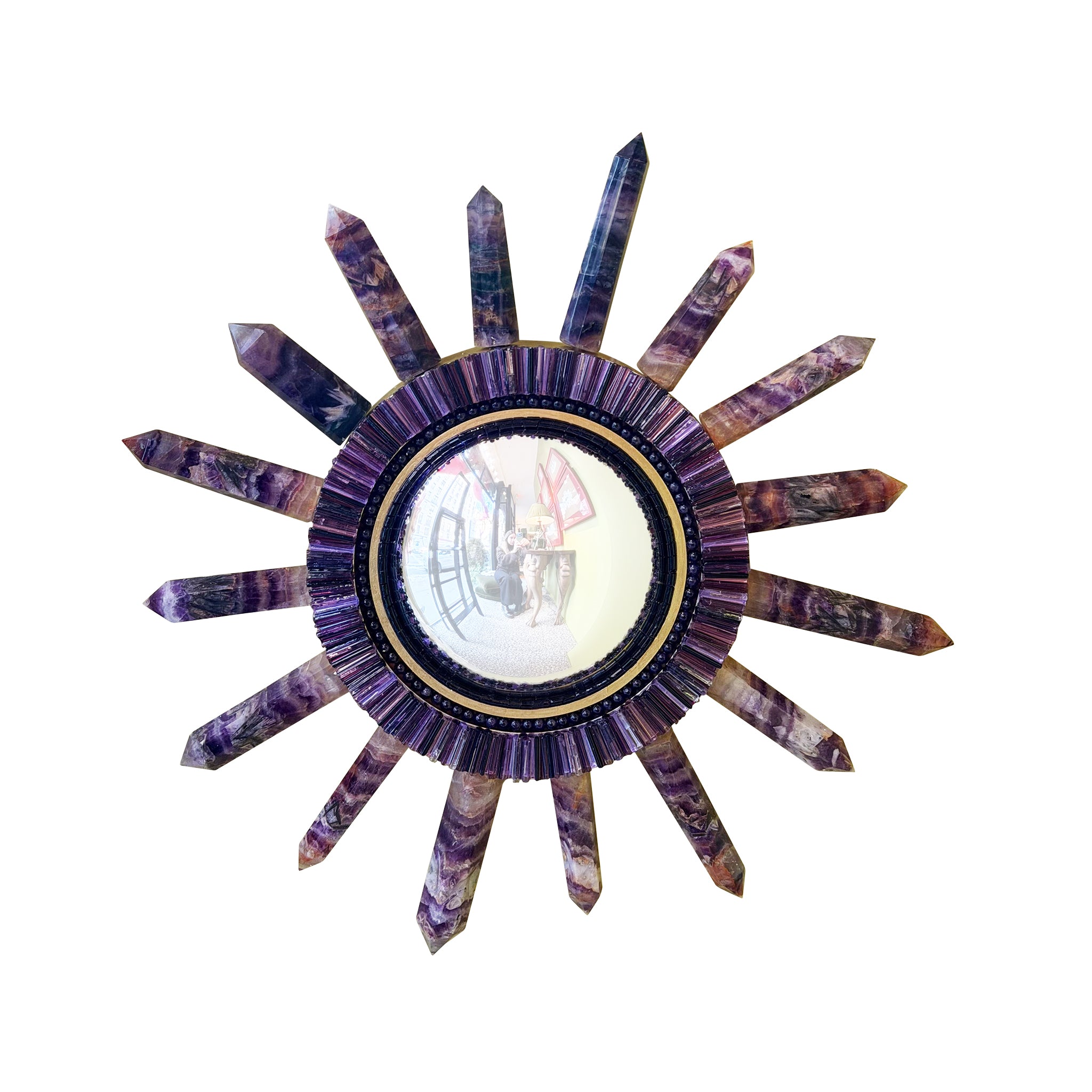 Dramatically striated fluorite points are mounted onto a gold leafed frame. A ring of Venetian glass rods in various shades of purple and an inner ring of amethyst spheres surround the convex frame.
