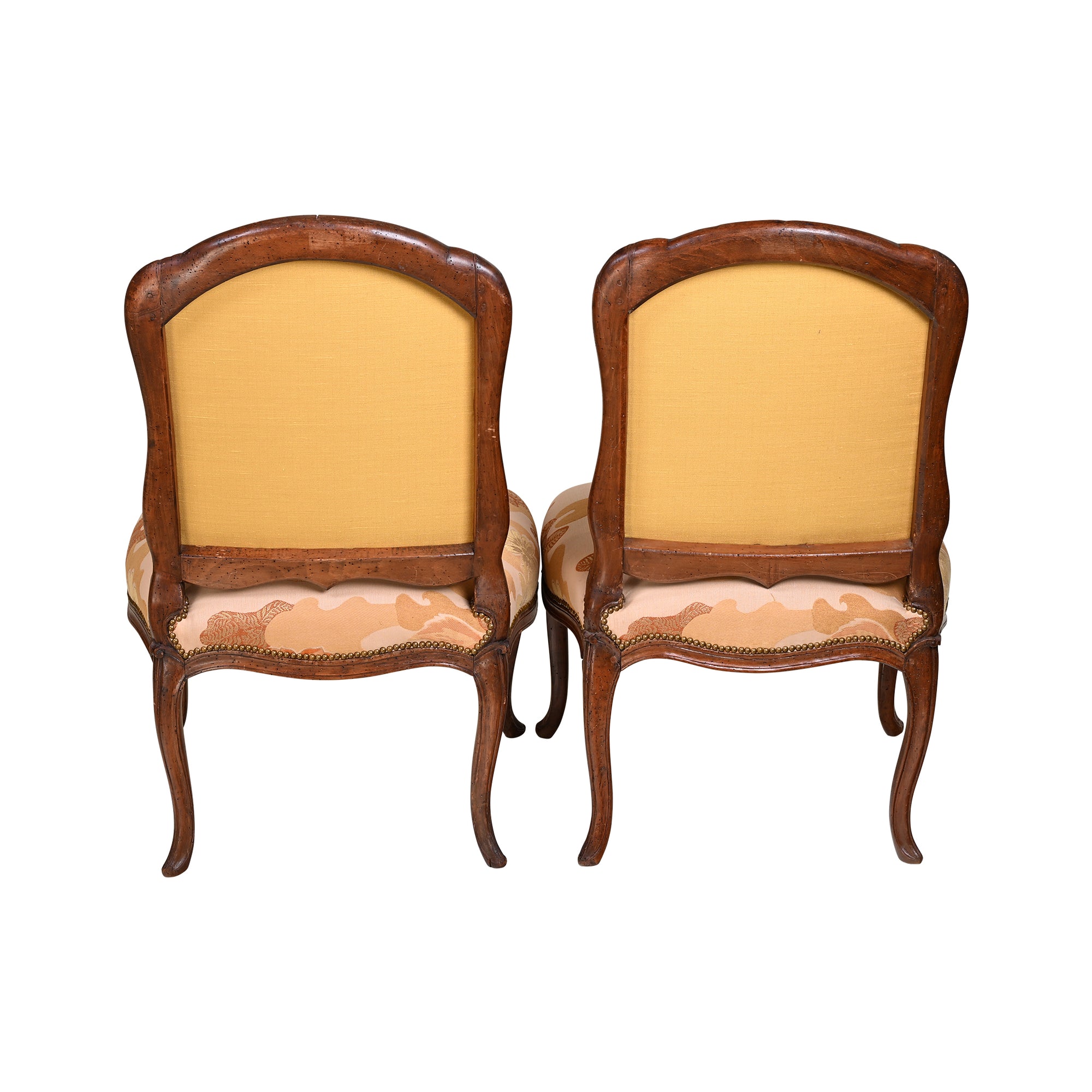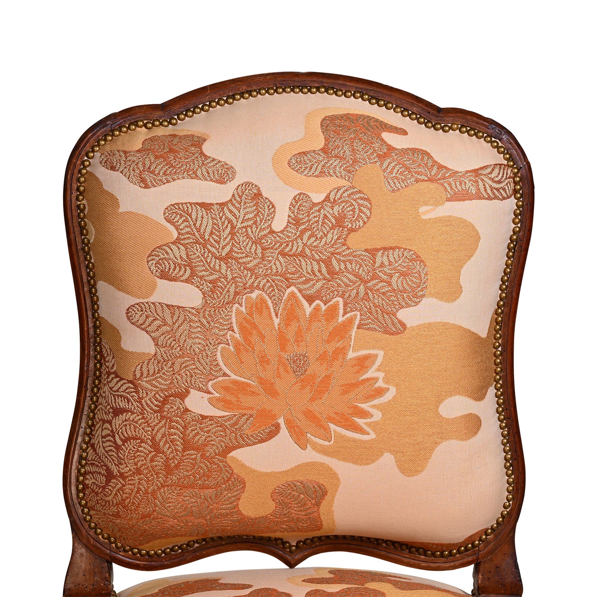 Newly reupholstered in Lian Dream in Coral by Laura Gonzales for Schumacher with brass nailhead trim.