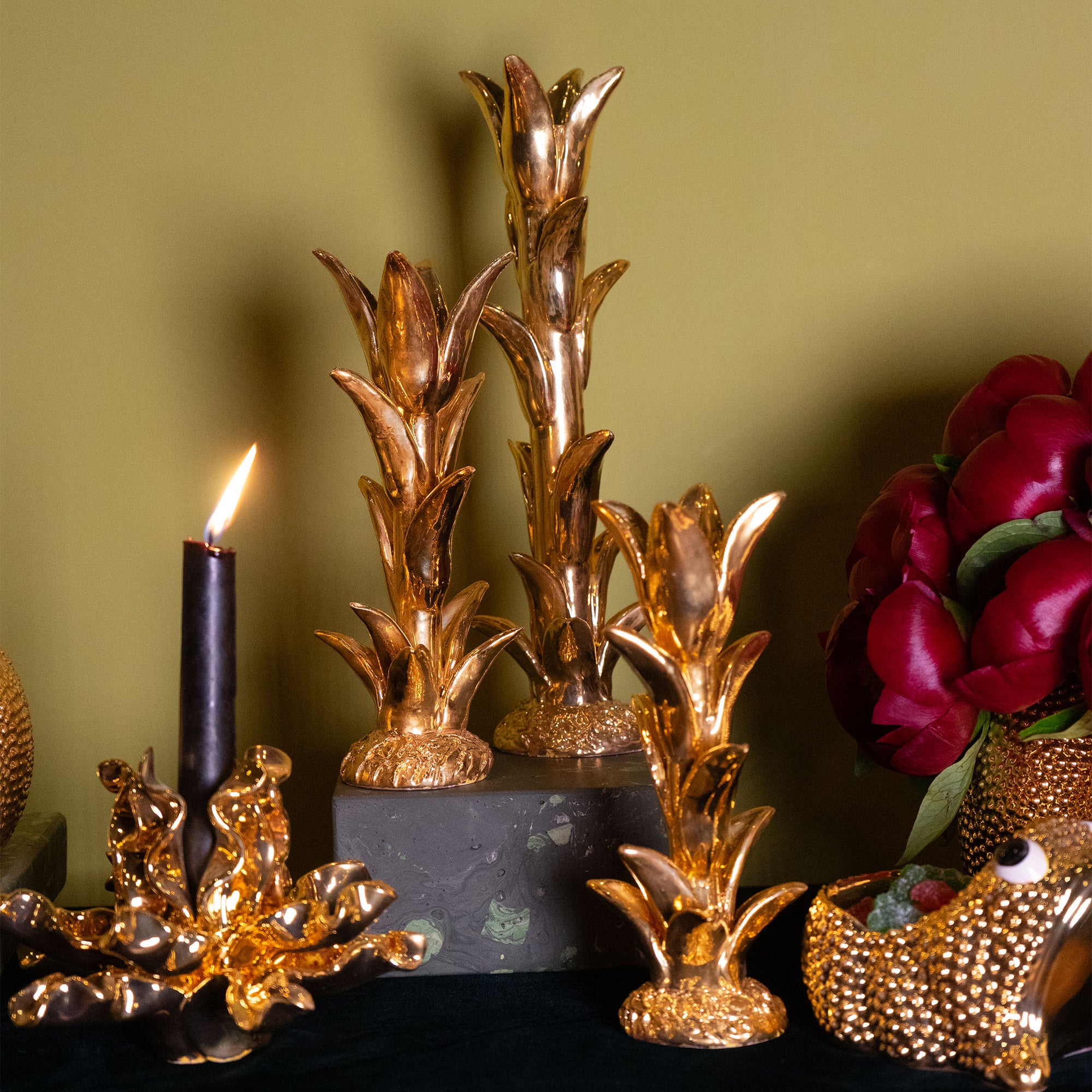 The limited-edition gold collection is sure to add glamour and sparkle to any holiday table setting. Hand made and glazed with real 12k gold by Paris ceramics studio, Jean Roger.