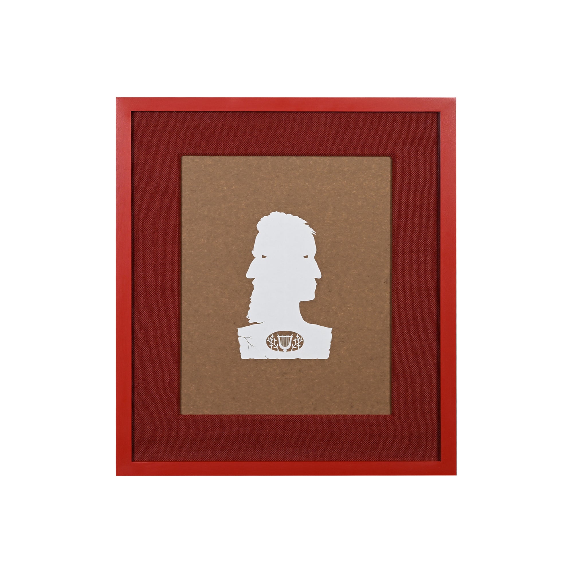 Framed on brown paper with red linen wrapped mat and custom painted red wooden frame and UV plexi.