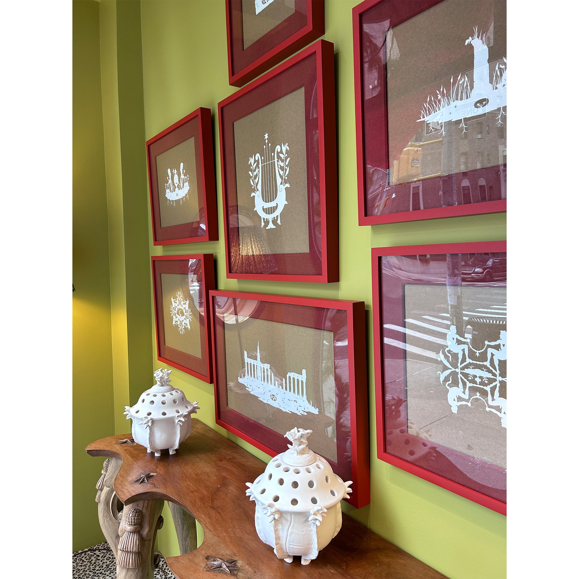 Framed on brown paper with red linen wrapped mat and custom painted red wooden frame and UV plexi.