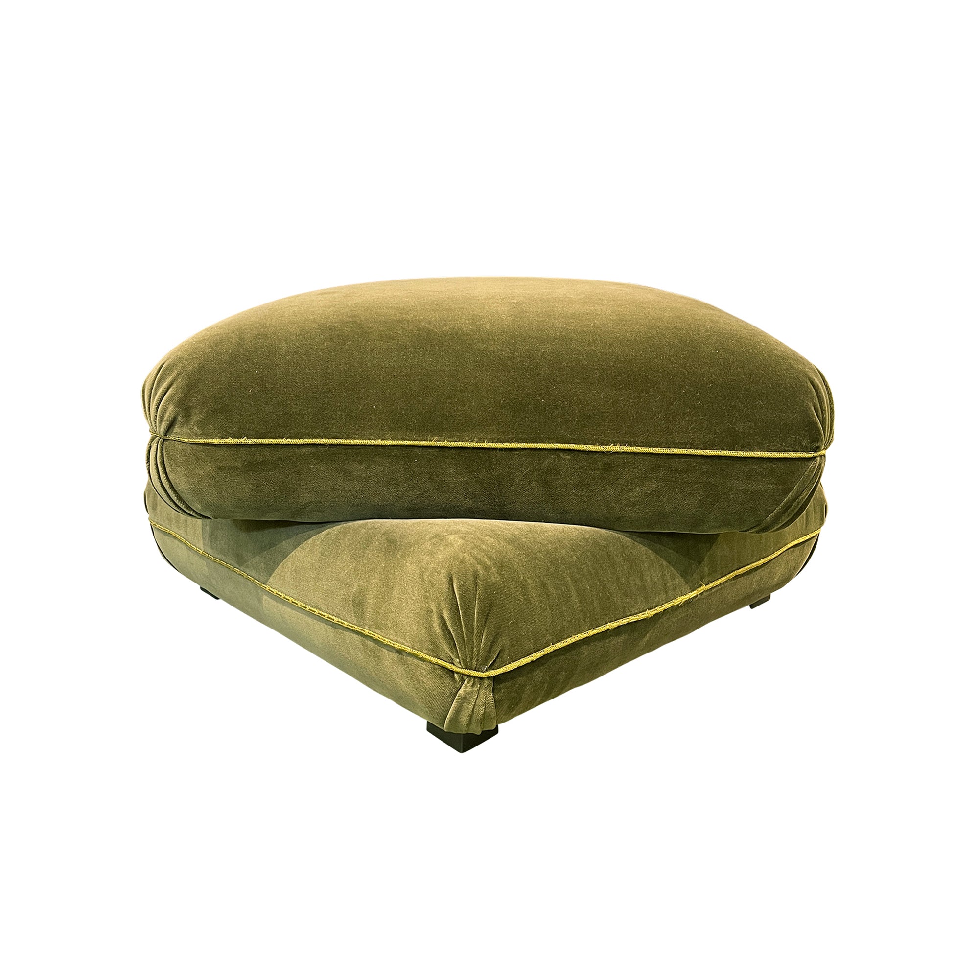 Inspired by Turkish-style seating, our new pillow ottomans are hand made and upholstered in a variety of luxurious cotton velvets. Generously sized, this chic piece is the perfect addition to an intimate seating area. The ottoman is comprised of two diagonally-stacked, connected cushions on wood legs that form a single, substantial piece.