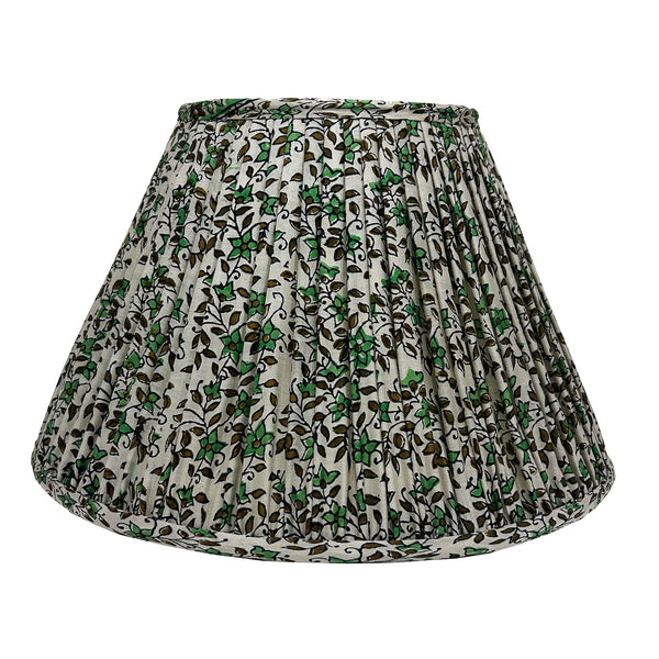 14" Silk Sari Lampshade - Green and Brown Floral Vine on Ecru