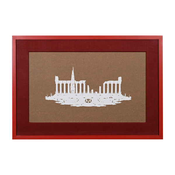 Framed on brown paper with red linen wrapped mat and custom painted red wooden frame and UV plexi.