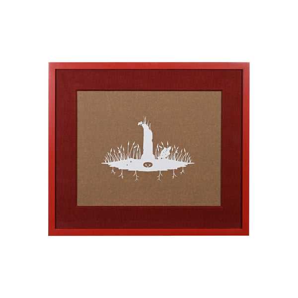 Framed on brown paper with red linen wrapped mat and custom painted red wooden frame and UV plexi.