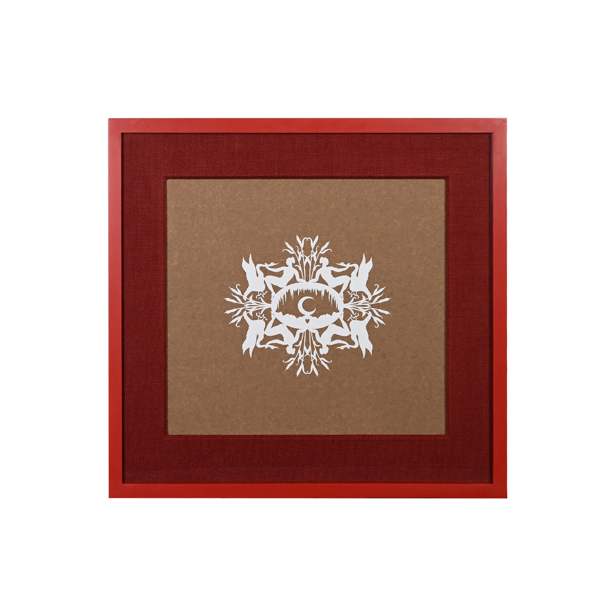 Framed on brown paper with red linen wrapped mat and custom painted red wooden frame and UV plexi.