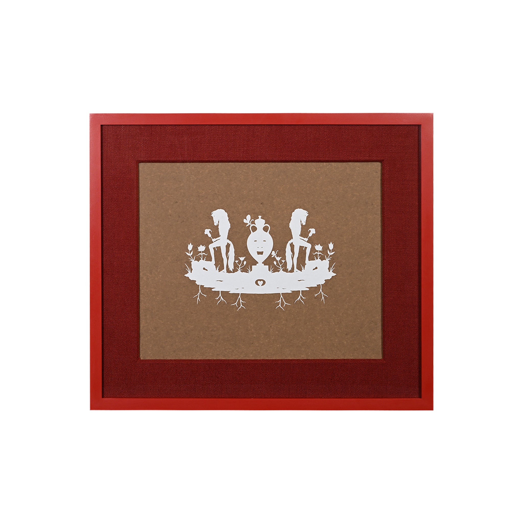 Framed on brown paper with red linen wrapped mat and custom painted red wooden frame and UV plexi.